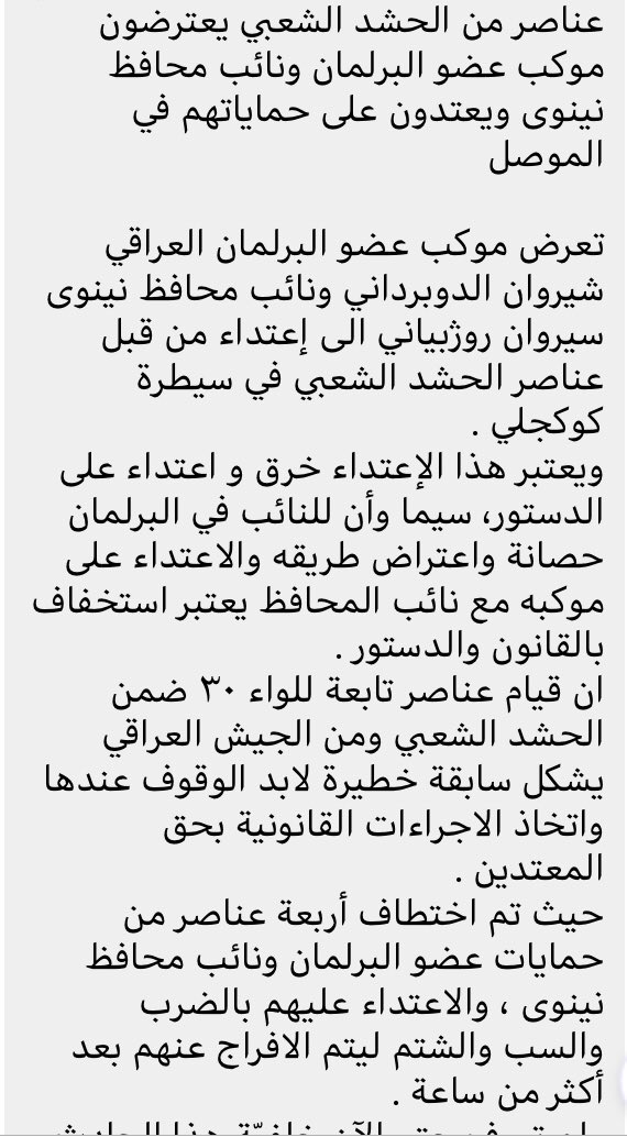 PMU Members intercept the convoy of MP and Deputy Governor of Nineveh and attack their protections in Mosul A convoy of member of the Iraqi parliament Sherwan Dubardani and deputy governor of Naynawa Sirwan Rojbayani, was attacked by members of PMU at Goggali checkpoint